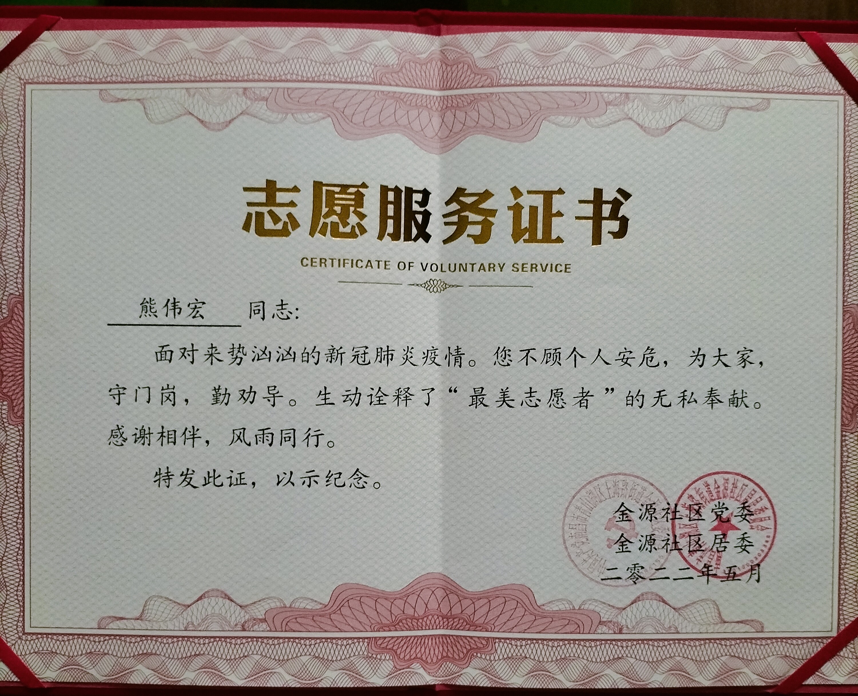 校内的党员群众在忙碌,居住校外的公司党员也不甘落后,他们主动报名参与所在社区的防疫志愿服务,熊宏伟就是其中一位。自3月22日以来,她在社区隔天值一个晚班,疫情期间从未间断,一本“疫情防控最美志愿者”证书是她两个月以来守护社区平安的最好见证。