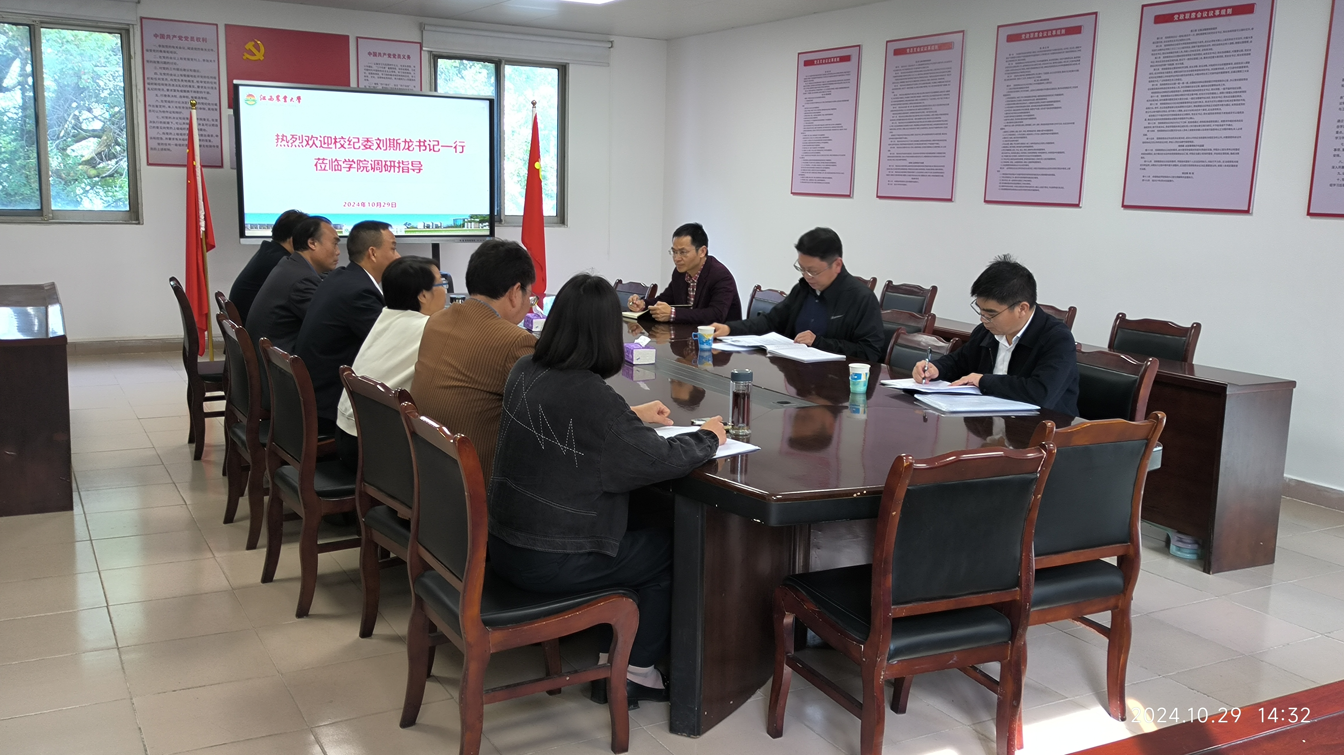 10月29日,校纪委书记刘斯龙、综合办公室主任胡永华、综合办公室副主任皮芳辉一行到公司调研指导,公司全体在家领导班子成员参加。