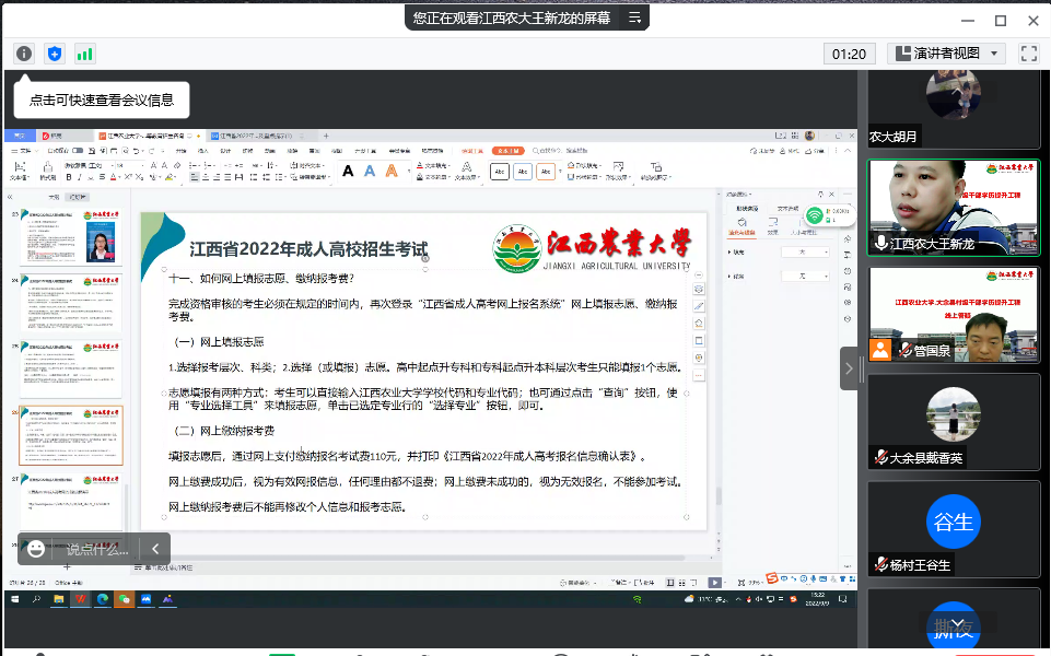 宣讲环节中,公司围绕江西省考试院关于成人高考的最新的各项政策,对2022年成人高考的报名流程、招生专业、收费和学位授予相关要求等进行了详细的介绍,强调今年成人高考与以往操作流程上的区别,提醒大家提前准备相应的审查材料。线上咨询环节中,各位村(社区)干部围绕报考条件、报考资格以及报考流程中的顾虑进行很好的互动。
