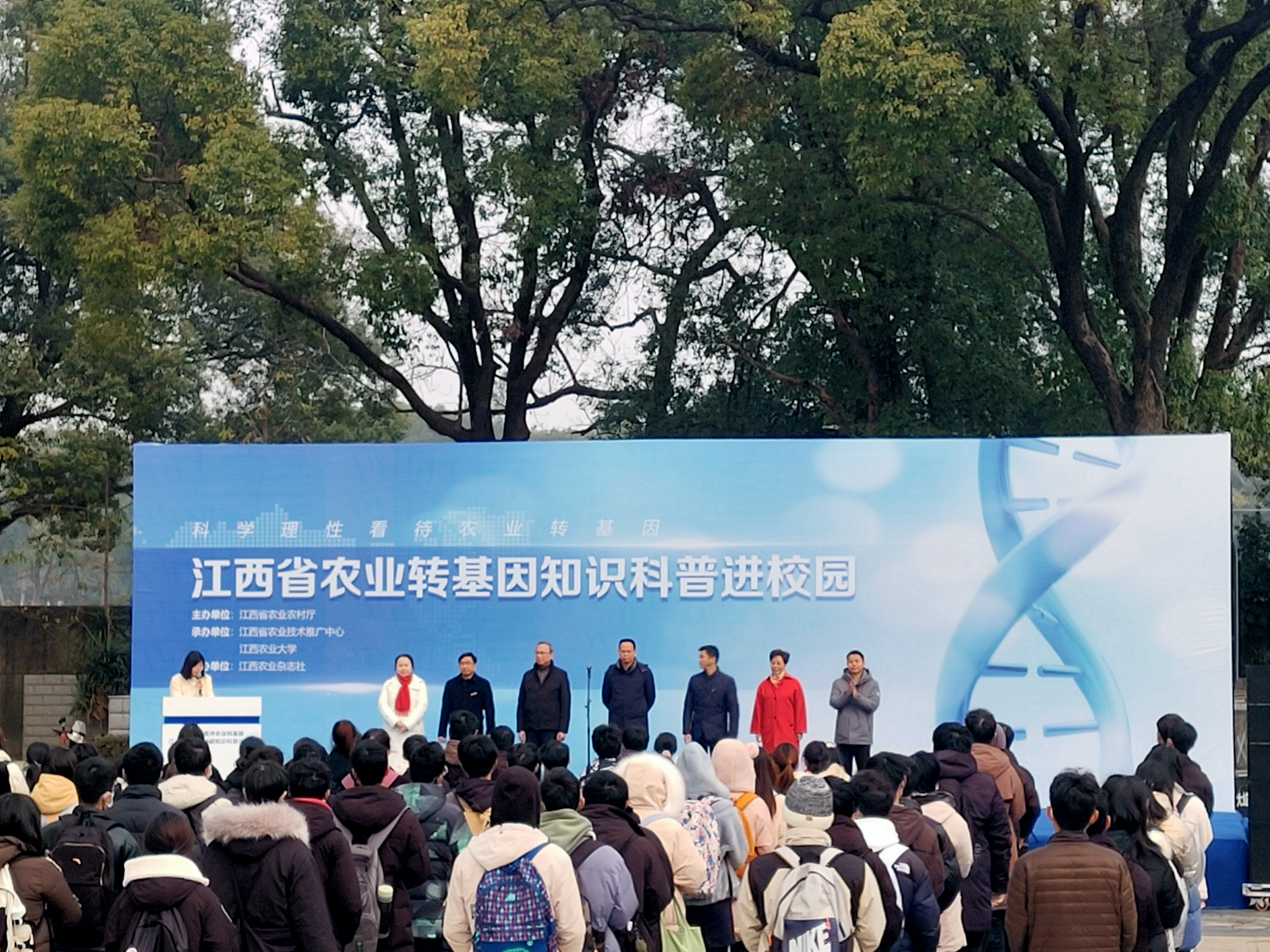 为宣传普及农业转基因知识,12月29日上午农业转基因知识科普进校园活动在公司体育训练馆前举行。本次活动由省农业农村厅主办,省农业技术推广中心和公司共同承办,江西农业杂志社协办。公司副董事长黄英金、省农业技术推广中心副主任曹阳、省农业农村厅科教处四级调研员吴加发、省农业技术推广中心科宣处长潘华和公司团委、军事体育部、PA视讯平台等单位负责同志以及150余名员工参加活动。