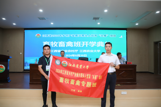 开学典礼上,动科院副教授毛辉荣和来自萍乡市芦溪县的“头雁”学员代表余善友进行了表态发言。汤雄杰为学员佩戴头雁徽章和公司校徽,蒋伍平为“头雁”班级授予班旗。
